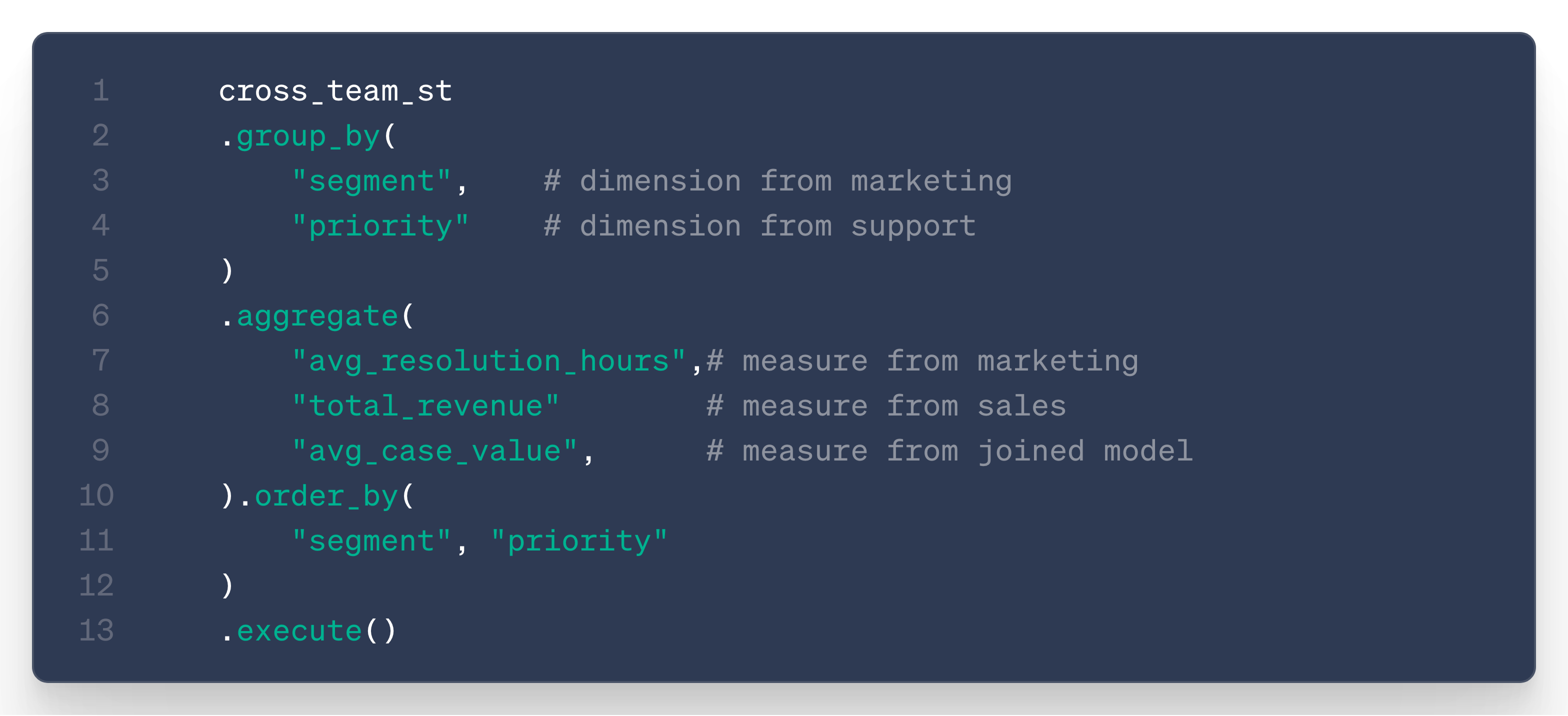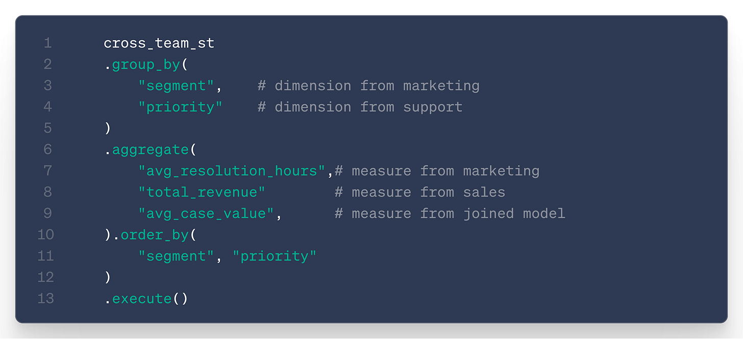 The user (or LLM) can then simply query the measure avg_case_value and aggregate it along any available dimension from any model.