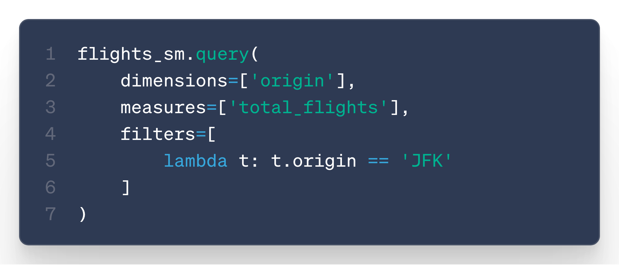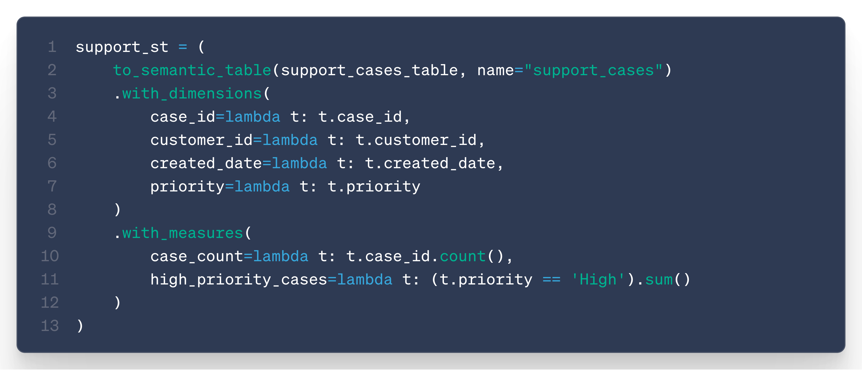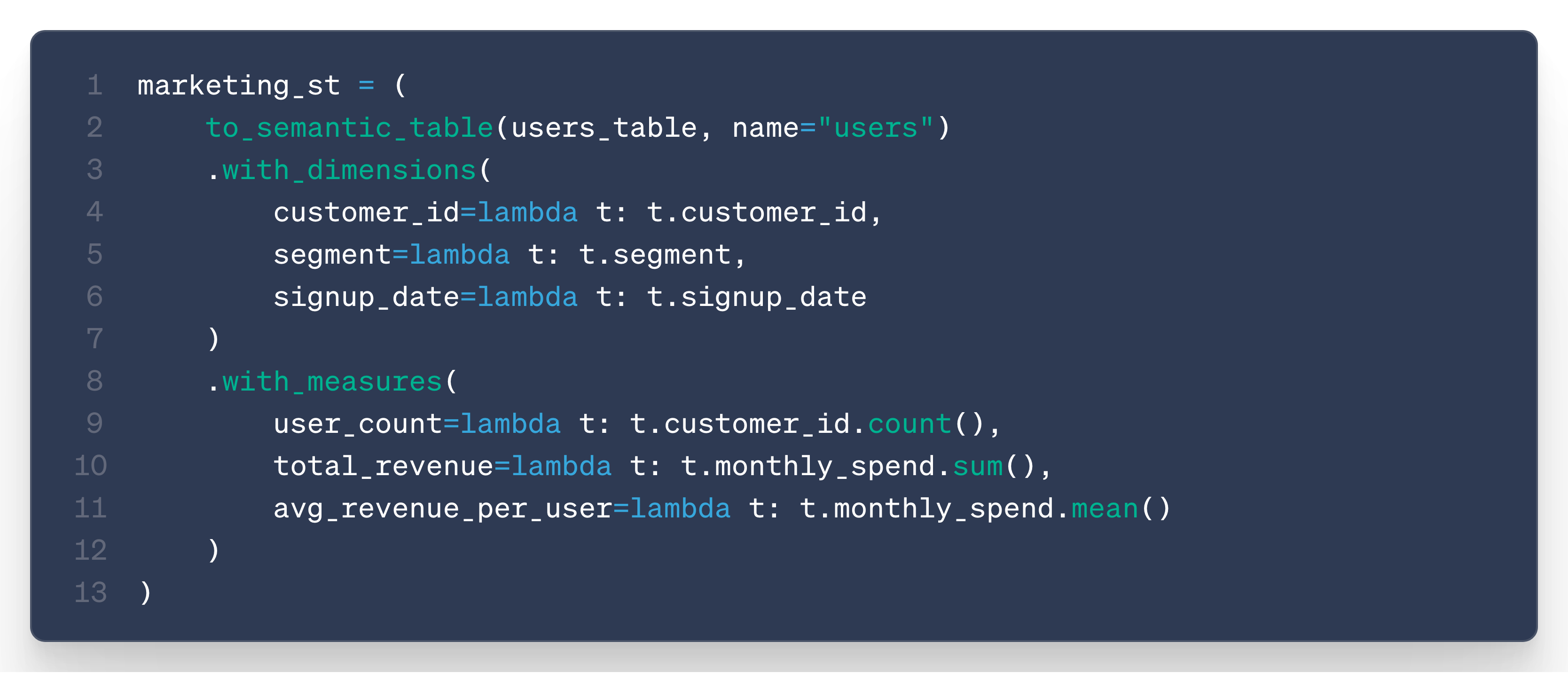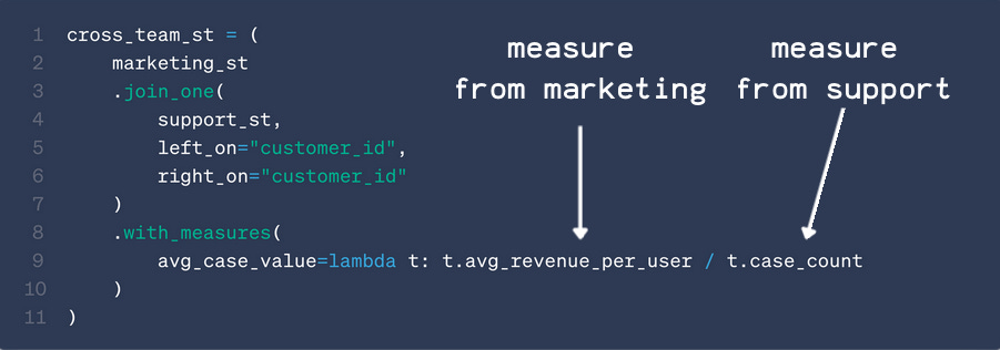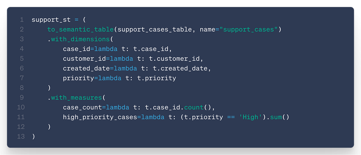 measures, dimensions, and join definitions (defined as lambda functions)