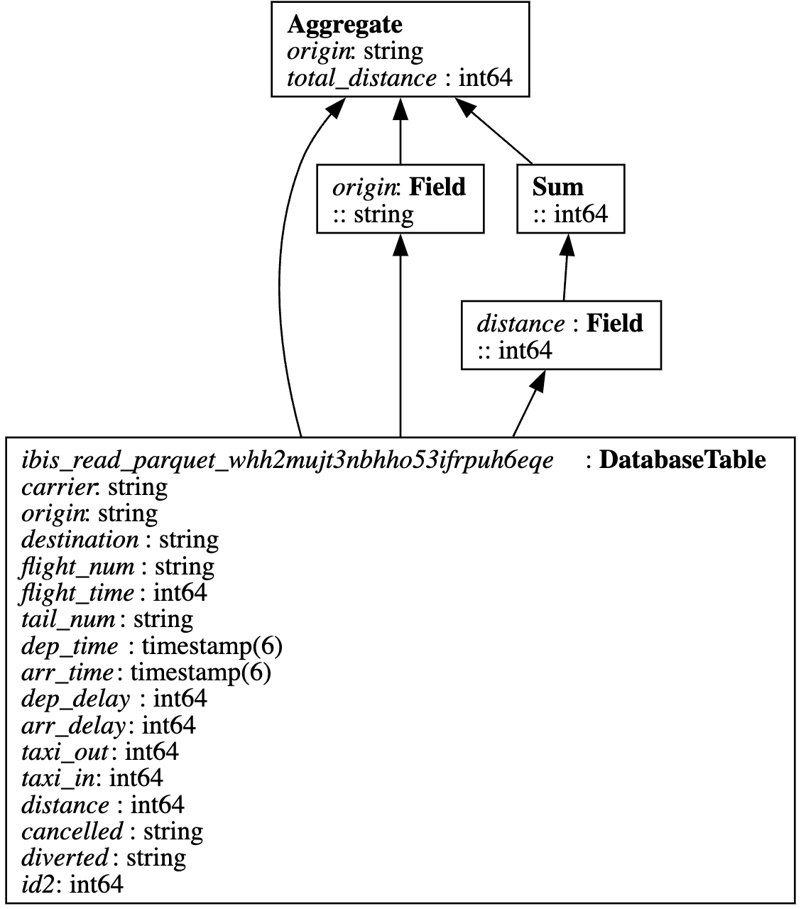 When the user defines agg_expr, no SQL is executed yet — Ibis creates the following expression graph: