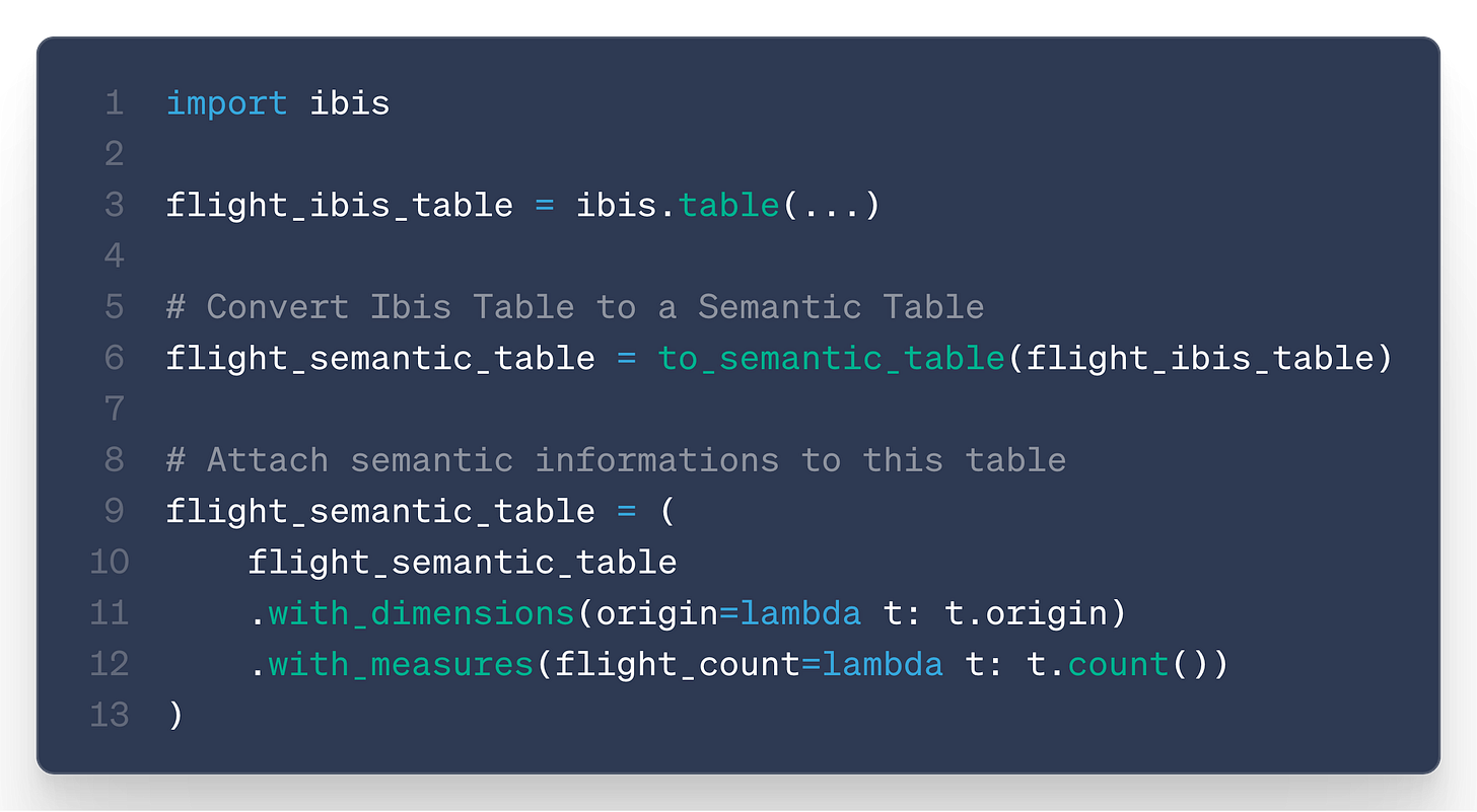 Concretely, this means we have introduced a new kind of Ibis table: semantic tables.