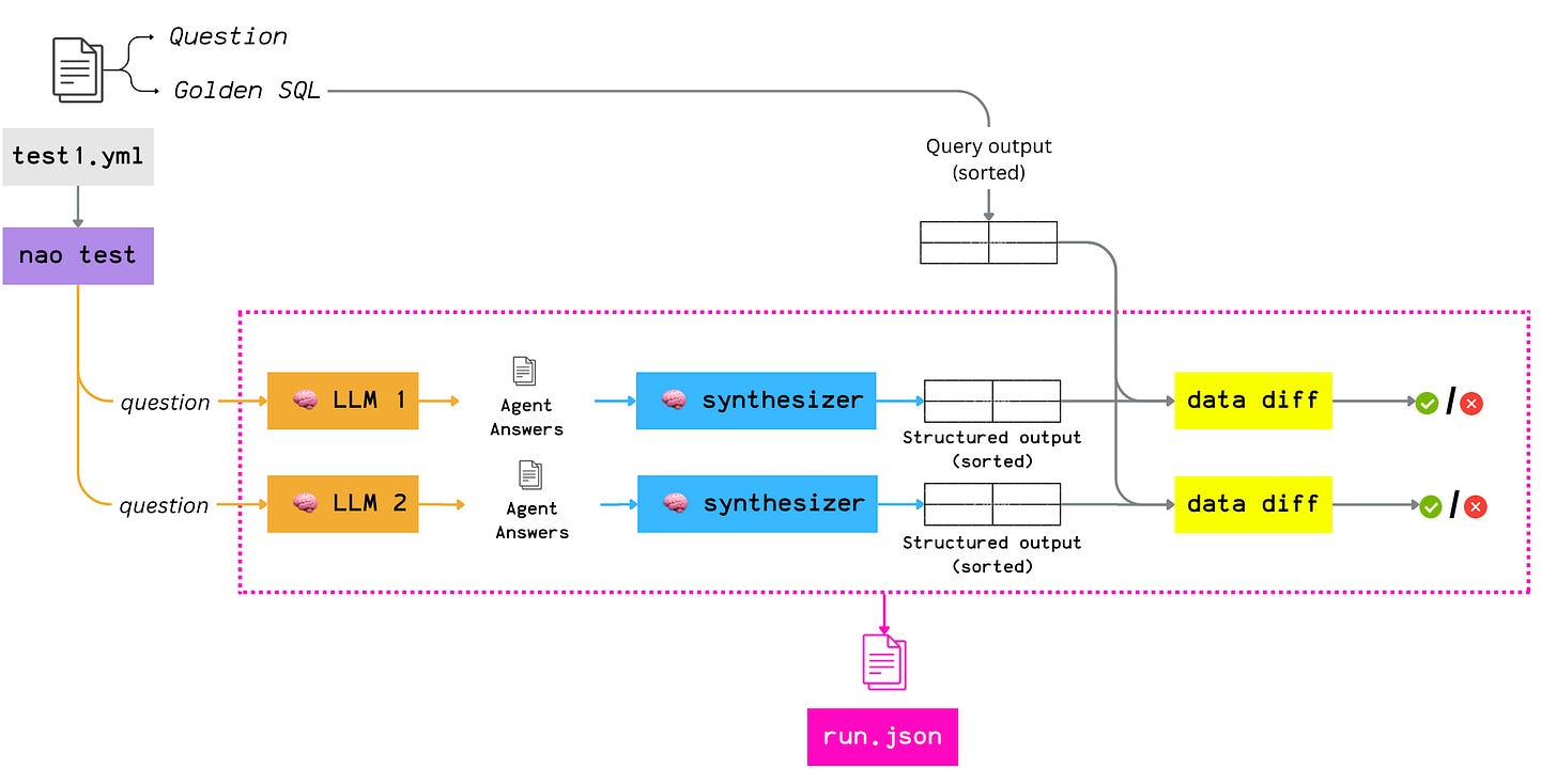 To support this non-deterministic agent behavior and still ship BI agents with real control, nao built its own testing framework.