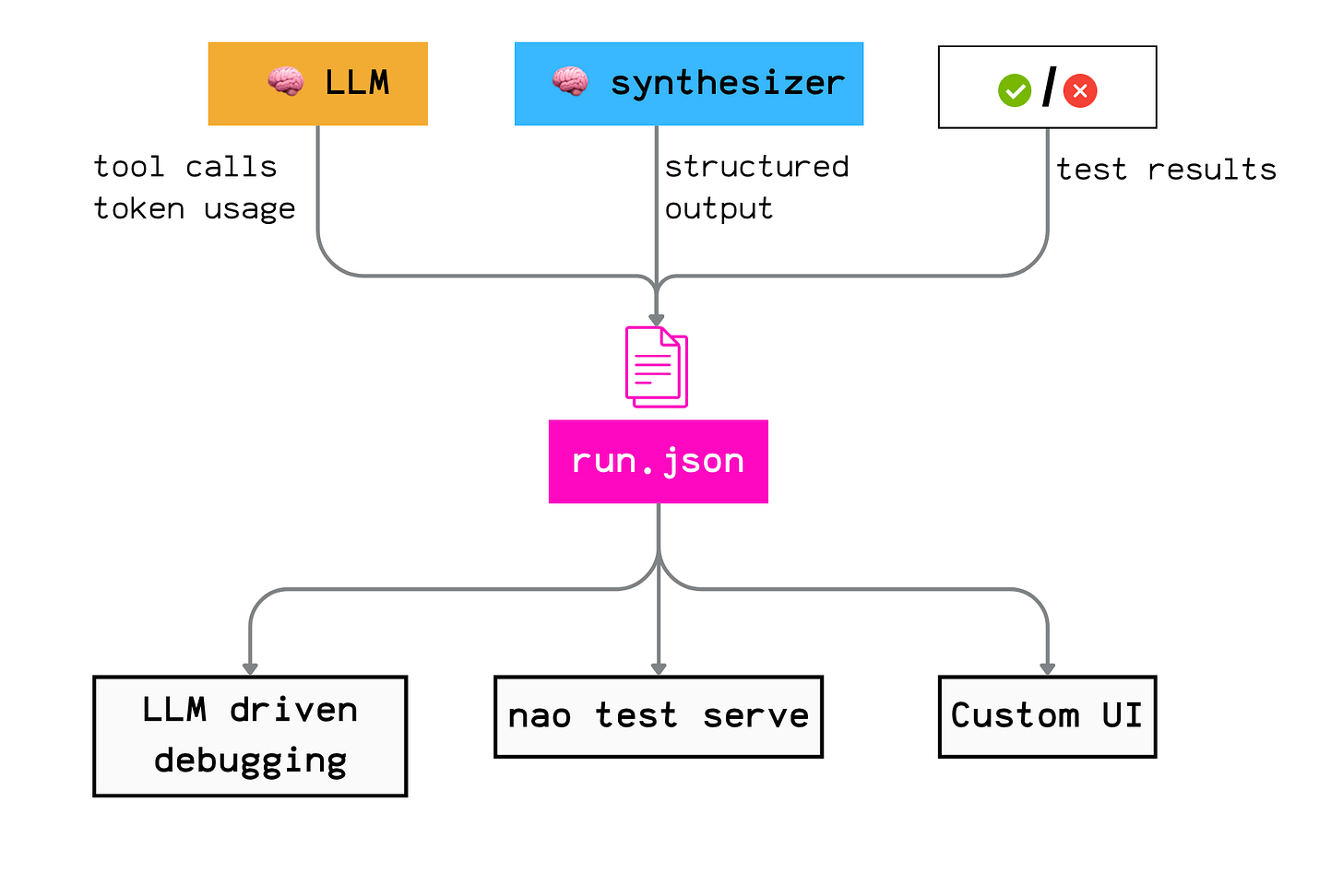 nao sends each YAML test case to a specific LLM. Then it: