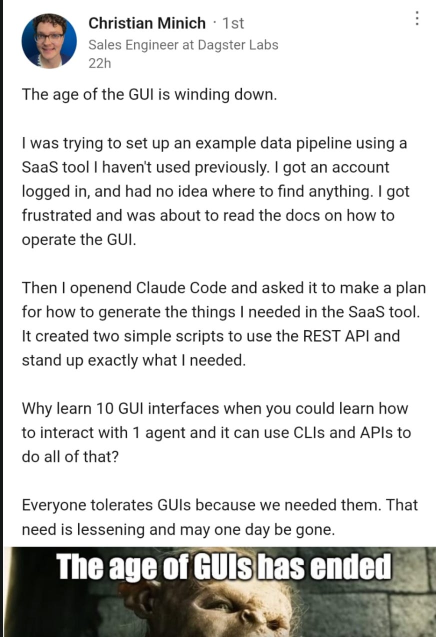 That’s why I think there’s opportunity in transforming services built around human UIs (web apps, dashboards) into agent-native interfaces (CLI, MCP, APIs).