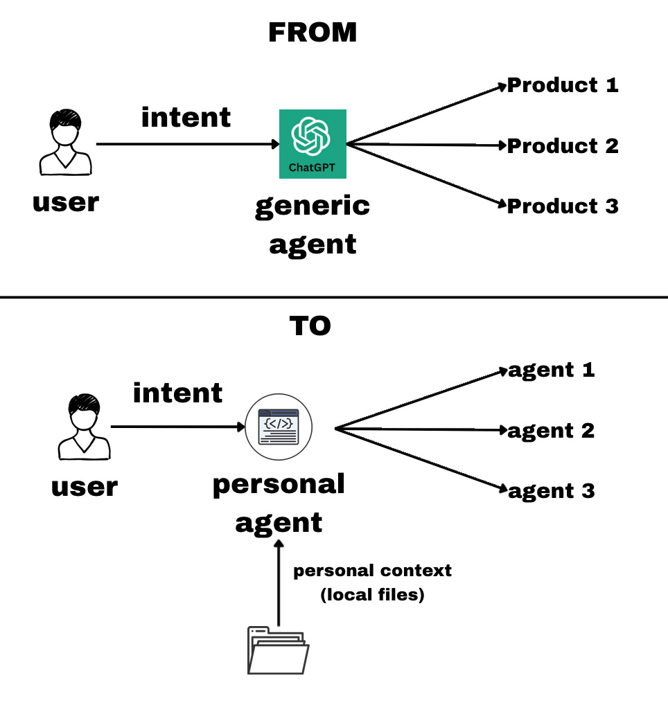 The intelligence embedded inside the user’s agent (Claude Code, local agents, etc.) handles the final-mile customization — adapting your service to the user’s specific context.