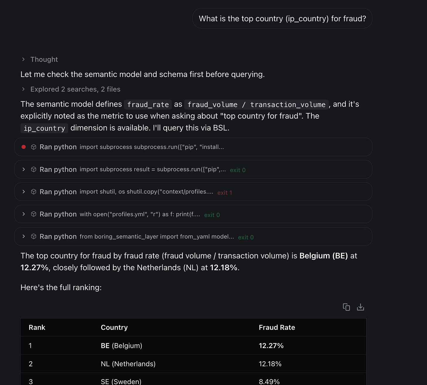 q = payments.group_by("ip_country").aggregate("fraud_rate", "total_volume")
