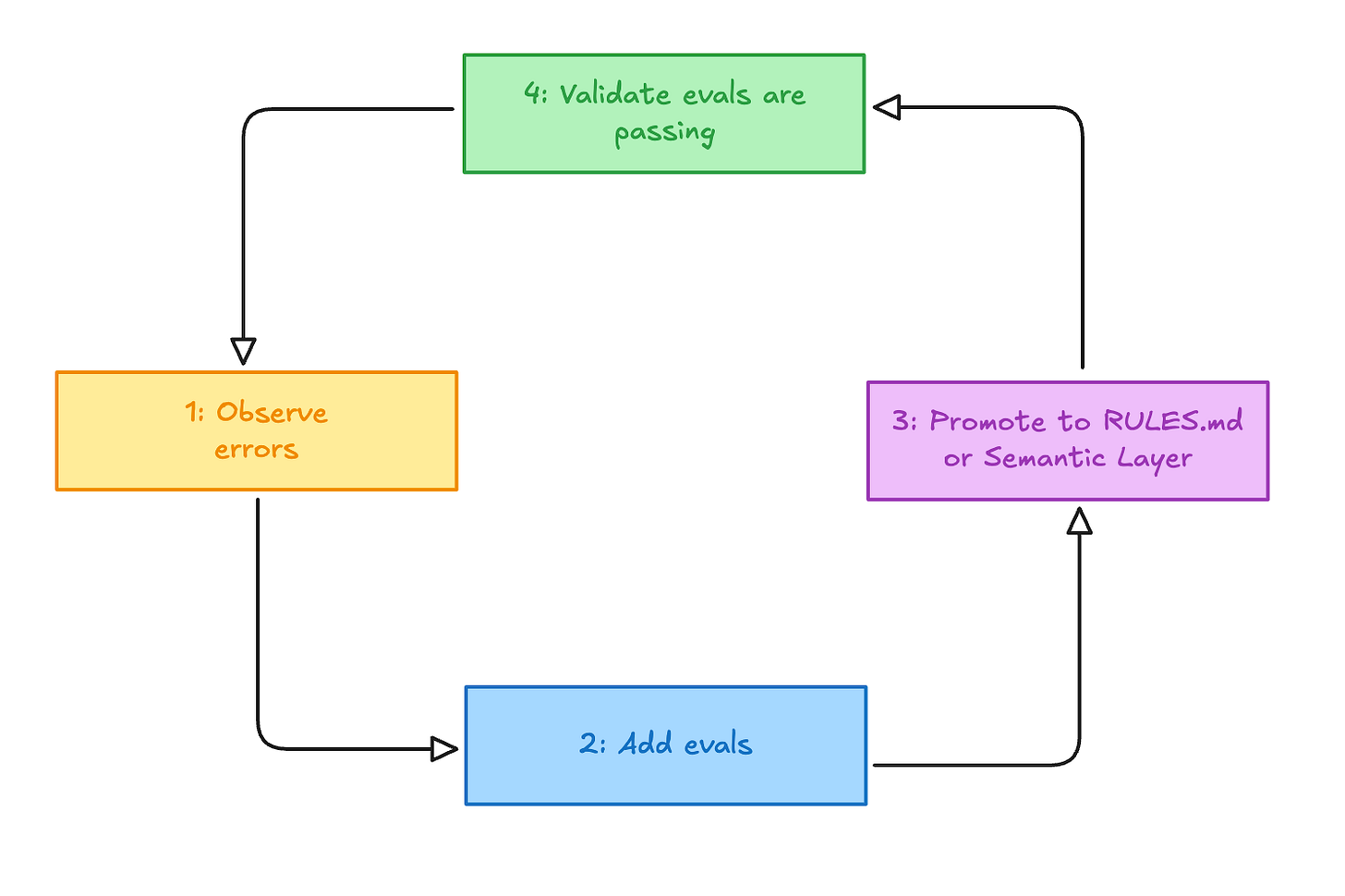 This loop—observe → eval → promote → validate—keeps RULES.md lean, grows the semantic layer with real usage, and prevents context drift.