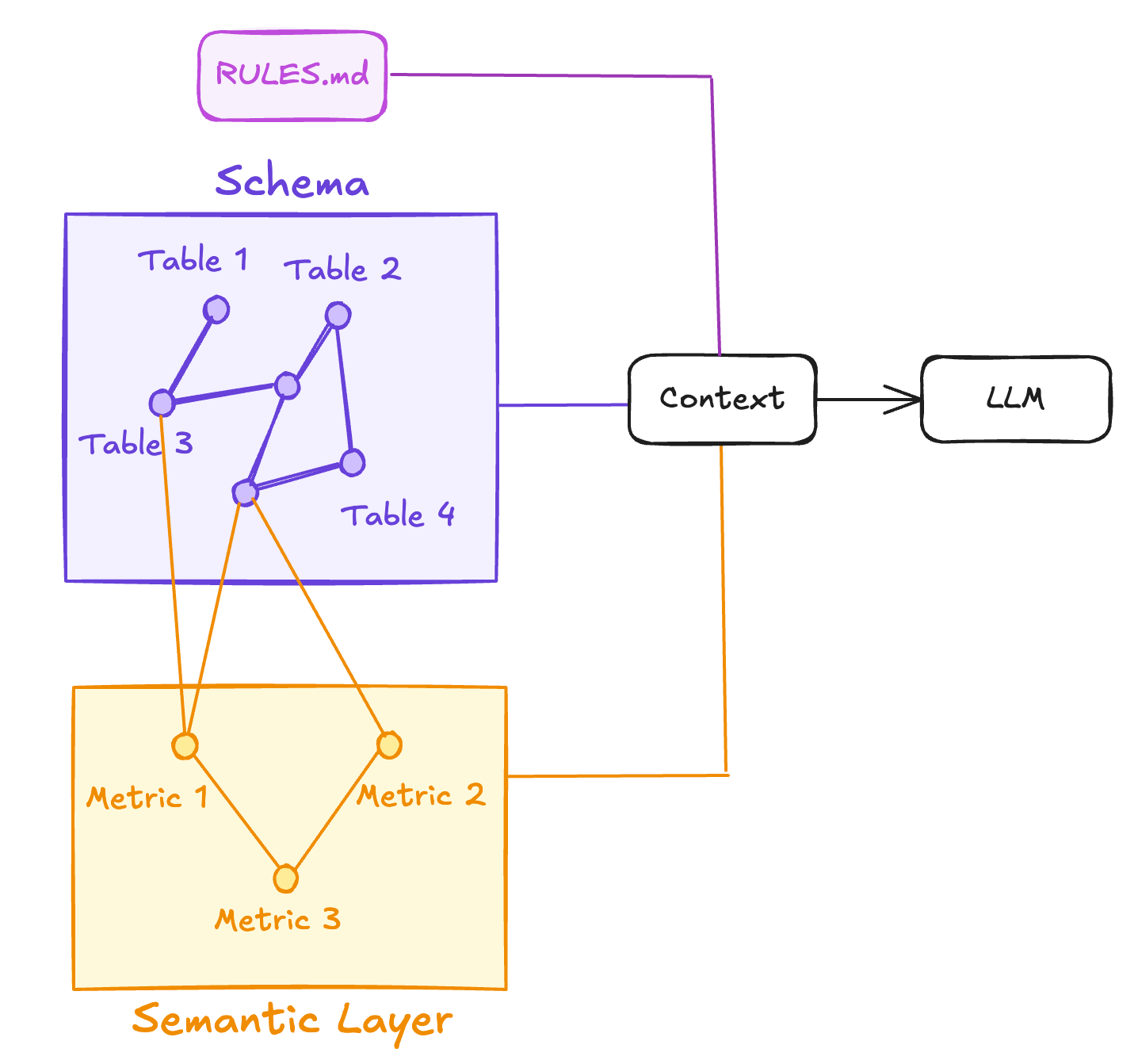 Start with high-level guardrails, fall back to metric definitions for business logic, and only drop down to the raw schema when it needs table/column details.
